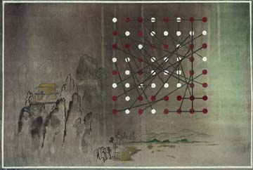 СМЕЖНОСТЬ ПАРНЫХ ПЕРЕМЕН В КВАДРАТЕ ВЭНЬ-ВАНА На этой картине каждой гексаграмме сопоставлен кружок: гексаграммам первой части "Книги Перемен" - белые кружки, гексаграммам второй части - темные кружки. Каждому столбцу соответствует триграмма; они перечислены в порядке Вэнь-вана: Огонь-Земля-Озеро-Небо-Вода-Гора-Гром-Ветер. Строки соответствуют перевернутым триграммам: Огонь-Земля-Ветер-Небо-Вода-Гром-Гора-Озеро. Гексаграмма располагается на пересечении строки (нижняя триграмма) и столбца (верхняя триграмма). Линиями соединены пары гексаграмм, точнее, соседние гексаграммы, входящие в разные пары, т.е. гексаграмма с четным номером соединена со следующей за ней гексаграммой с нечетным номером. Ни с чем не соединены первая гексаграмма Цянь-"Творчество", состоящая из двух триграмм Небо, и последняя гексаграмма Вэй-цзи -"Еще не конец", состоящая из триграмм Вода и Огонь. Парные гексаграммы, получающиеся друг из друга переворотом, симметричны относительно главной диагонали квадрата. На самой диагонали находятся четыре пары симметричных гексаграмм, получающихся друг из друга инверсией черт. В этой картине я пытался передать то ощущение, которое китайцы называют "духом древности". Отсюда - цветовая гамма пейзажа, имитирующая цветовую гамму древних китайских свитков. |