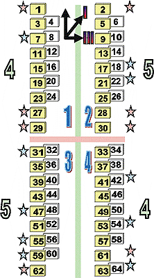 Одну из таких закономерностей можно увидеть уже на этом плакате. Здесь синими звездочками отмечены таблички с гексаграммами, у которых равное число черт ЯН и ИНЬ. Каждой такой табличке соответствует пара гексаграмм типа ФАНЬ, и общее число черт ЯН (также как ИНЬ) равно 6. Это число черт свойственно также кажой паре гексаграмм типа ДУЙ; гексаграммы, входящие в такие пары отмечены красными звездочками. Мы видим, что 1-ый и 4-ый квадранты содержат по 4 звездочки, а 2-ой и 3-ий - по 5 звездочек. Поэтому 2-ая и 3-я дихотомии каждая делит И-цзин на две части, в которых одинаковое число звездочек - 9.