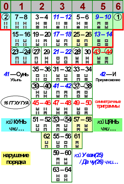 Прежде всего, обратим внимание на то, что верхняя часть И-цзина (первые 30 гексаграмм) занимает целиком верхние три строки таблицы. Исключение составляет только уже знакомая нам пара гексаграмм #43-44.