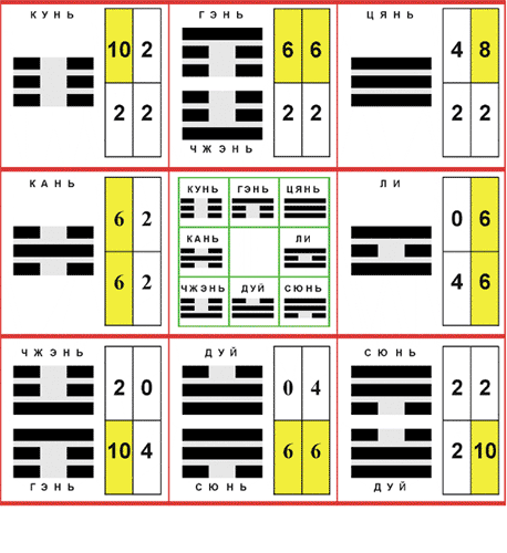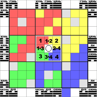 Таким образом, получается девятиклеточный квадрат, 4 угла которого соответствуют квадрантам И-цзина, а 4 средние клетки сторон - соответствующим частям И-цзина: верхней, нижней, левой и правой, то есть, паре соседних квадрантов. Этим 8 клеткам соответствуют 8 триграмм, тяготеющих к ним по расположению в И-цзине.