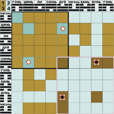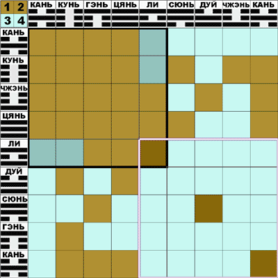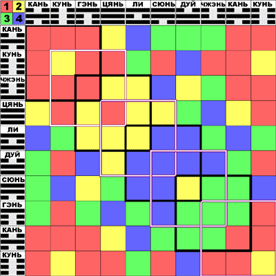Четыре квадрата в черной рамке соответствуют четырем триграммам из углов нашего пространственного расположения триграмм: КУНЬ, ЦЯНЬ, СЮНЬ, ЧЖЭНЬ. Можно увидеть, что каждый из этих квадратов содержит не менее семи из девяти клеток, окрашенных в один цвет, то есть, относящихся к соответствующему квадранту И-цзина.