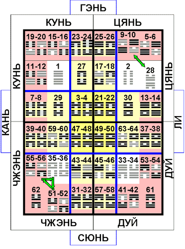 Правда, правило перестает быть глобальным: оно не объясняет, какие гексаграммы должны попадать в центральные клетки квадрантов. В порядке Вэнь-вана это гексаграммы: