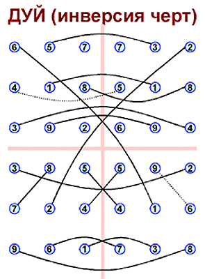 При таком расположении табличек с гексаграммами можно обнаружить еще одну закономерность, связанную с операцией инверсии черт ДУЙ. На этом плакате изображена та же матрица, только табличка обозначена кружком, в котором написан относительный номер этой таблички в соответствующем квадранте для порядка Вэнь-вана. Линии соединяют таблички, содержащие взаимно-инвертированные гексаграммы. Пунктирная линия соединяет таблички с парами гексаграмм, переходящих друг в друга операцией ДУЙ. Таких табличек всего 4. Как видим, получается картинка симметричная относительно вертикальной оси.