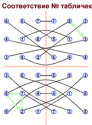 На этом плакате зелеными стрелками обозначены требуемые изменения (точнее, обратные изменения, которые возвращают к предыдущему расположению). Две таблички из 2-го квадранта меняются местами и три таблички из 3-го квадранта меняются местами по циклу. Эти изменения затрагивают 5 из 36 табличек, то есть, примерно 14%. Конечно, в результате таких изменений исказится плакат с инверсией черт - картинка перестанет быть полностью симметричной. Зато картинка с линиями, соединяющими таблички с одинаковыми номерами, станет полностью симметричной.