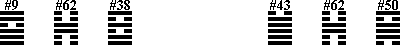 ПЕРЕХОД: Из первой гексаграммы дождя #9 могут быть вычленены две "взаимопроникающие триграммы" - ху гуа, которые охватывают: 1) вторую, третью, четвёртую и 2) третью, четвёртую, пятую черты гексаграммы. Они используются соответственно как нижняя и верхняя триграммы для получения новой, производной гексаграммы, характеризующей более глубокое состояние ситуации. Это следующая, вторая гексаграмма дождя ╧ 38 - Разлад: